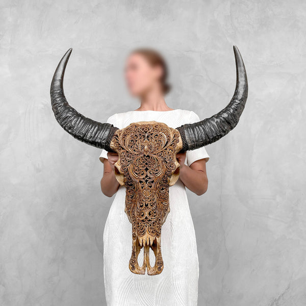 Onze authentieke schedels zijn het bijproduct van de lokale Balinese landbouwindustrie. Deze zouden anders afvalproducten zijn, maar wij maken er gedetailleerde kunstwerken van.