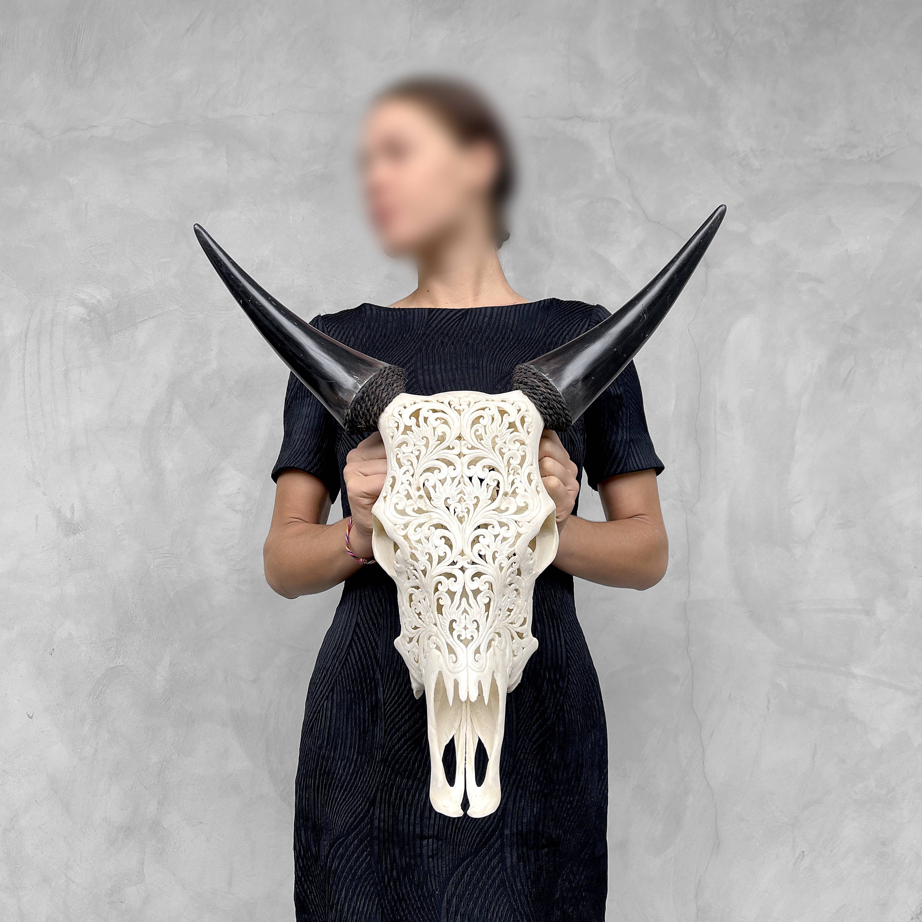 Stap een wereld binnen waar traditie en verfijning elkaar ontmoeten met onze gesneden witte koeienschedel. Dit meesterwerk, versierd met slanke, effen zwarte hoorns, belichaamt de essentie van tijdloze schoonheid en cultureel erfgoed. Of het nu in een moderne omgeving wordt geplaatst of een vleugje rustieke charme toevoegt aan een traditionele inrichting, dit unieke stuk wordt een centraal punt dat bewondering oproept en gesprekken op gang brengt.